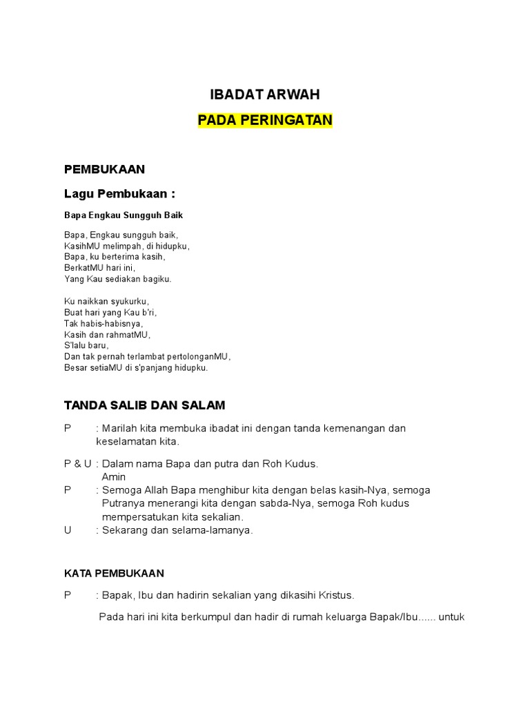 Jumat 08 Mei 2015 We Shall Rise Again Peringatan Arwah NOT ANGKA VIDEO Selasa 25 Oktober 2016 Ibadat Peringatan Arwah Hari Ke-7 LIRIK Rabu 26 Oktober 2016 Doa Pada Kematian Seseorang Umum LIRIK Rabu 26 Oktober 2016 Doa Pada Kematian Seorang Anak LIRIK Kamis 27 Oktober 2016. Surat Al Fatihah ini ditujukan untuk arwah yang kita doakan. Terdapat bacaan doa-doa yang umumnya digunakan.